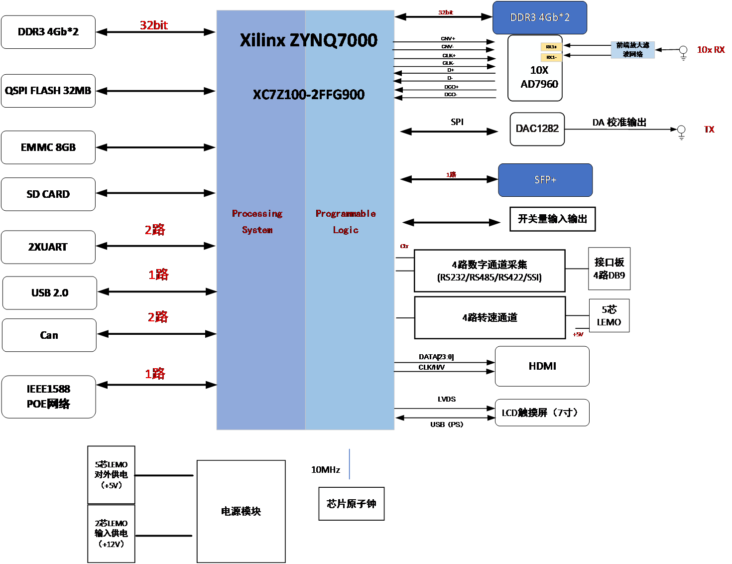 This product provides a variety of sensor access interfaces, support a variety of types of sensors real-time acquisition, processing, display and other functions. The main processor uses the XC7Z100-FFG900 chip, which has a 444K logic unit and a dual-core ARM Cortex-A9 MPCore processor. PL part of the programmable logic can achieve a variety of sensor protocol conversion, data processing and other functions. The PS part of the dual ARM core can support the running of the Linux operating system, real-time multitasking and human-computer interaction interface and other functions
