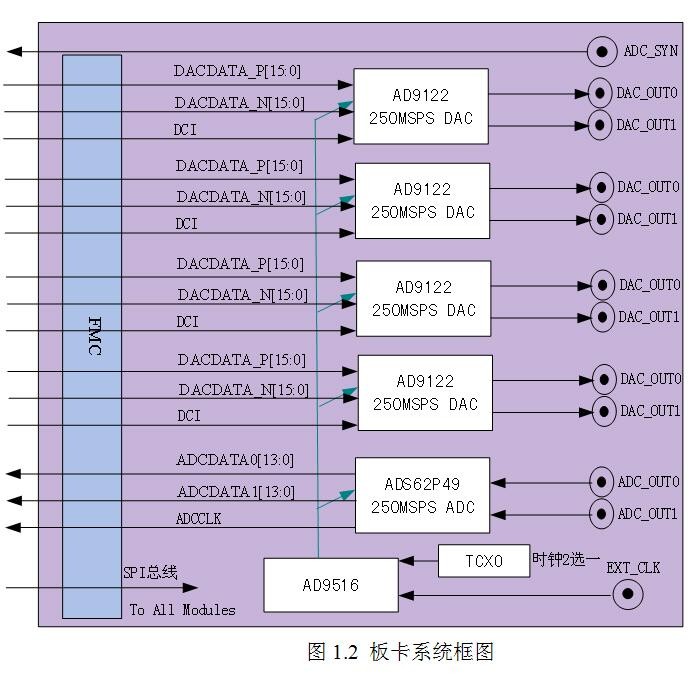 1. Board Overview FMC229-8-channel DAC&2-channel ADC FMC daughter card is an 8-channel 250Msps DA 16bit, 2-channel AD 250Msps 14bit AD board independently developed by the company. The board adopts the standard FMC daughter card architecture, which can be easily connected with other FMC boards at high speed, and can be widely used in high-frequency analog signal acquisition, radar system testing and other occasions. 2. Function Introduction 1. DAC uses ADI's AD9122, 2 channels 250M, 16bit, 4 pieces in total; 2. ADC uses TI's ADS62P49, 2 channels, 250M, 14bit, 1 piece in total; 3. The clock adopts AD9516, which supports on-board clock and external clock; 4. A total of 12 SSMB interfaces and 1 FMC/HPC interface; 5. The external synchronization signal is used to synchronize the ADC data sampling signal, which is optional; 6. External clock enables multiple daughter boards to work under the same clock.