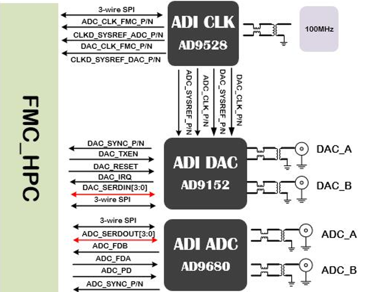 - FMC interface, supports 2-way AD input and 2-way DA output.